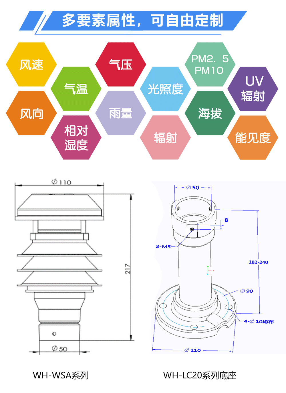 WH-WSA系列气象站是一种能测量多气象参数的一体化微型气象站,能同时测量大气温度、大气湿度、风速、风向、气压、雨量、辐射、照度、UV辐射、能见度、PM2.5和PM10等多种气象要素。设备采用低功耗芯片。由于采用了新技术和新工艺,使结构更加紧凑小巧。还可以选配MINI能见度检测模块,非常适合智慧城市控制系统使用。可根据用户需求,所有检测参数可以任意选配和组合。