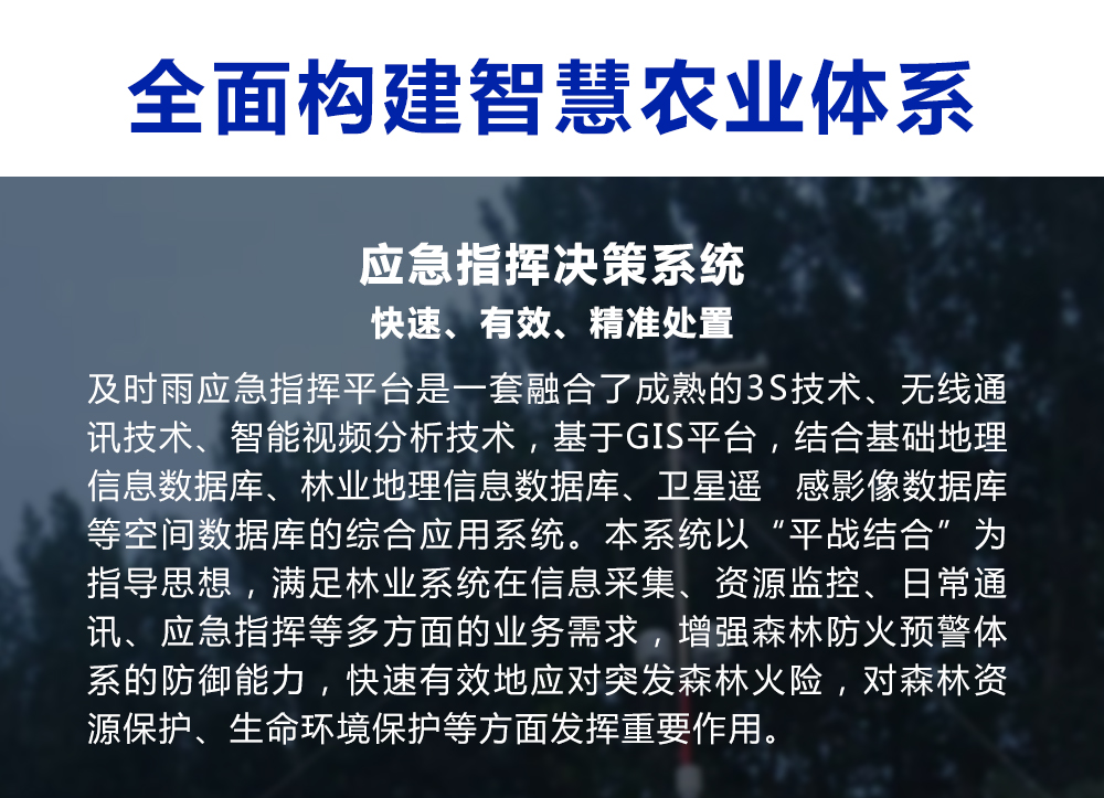 应急指挥平台是一套融合了成熟的3S技术、无线通讯技术、智能视频分析技术,基于GIS平台,结合基础地理信息数据库、林业地理信息数据库、卫星遥感影像数据库等空间数据库的综合应用系统。本系统以“平战结合”为指导思想,满足林业系统在信息采集、资源监控、日常通讯、应急指挥等多方面的业务需求, 增强森林防火预警体系的防御能力,快速有效地应对突发森林火险,对森林资 源保护、生命环境保护等方面发挥重要作用。