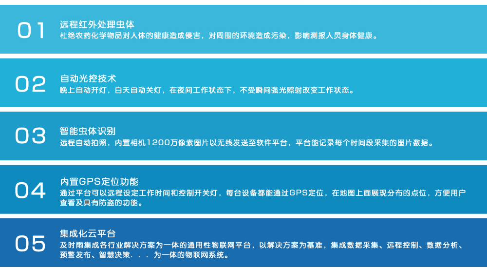 物联网虫情测报预警站是我公司推出的新一代害虫自动测报系统,本系统主要利用现代光、电、数控技术、无线传输技术、户联网技术、构建出一套害虫生态监测及预警系统。该系统集害虫诱捕和拍照、环境信息采集、数据传输、数据分析于一体,实现了害虫的诱集、分类统计、实时报传、远程检测、虫害预警和防治指导的自动化、智能化。