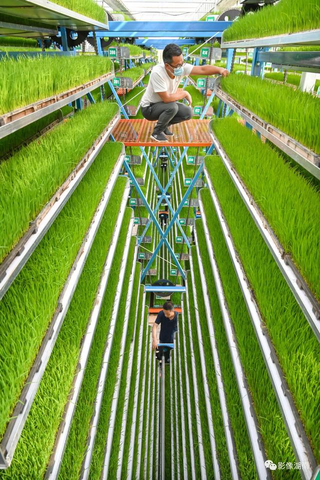 益阳市赫山区的智慧农业育秧工厂,3000多平方米现代化温室大棚,一盘盘待栽插的秧苗郁郁葱葱,一台台高大整齐排列的循环立体运动式育苗设备上下循环,让秧苗充分照射,为万余亩稻田提供机插秧苗。