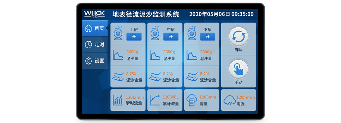 为了满足教育研究机构和科学研究机构对实时降雨的需求,银河测控自主研发了地表径流泥沙监测系统,该系统用于径流站,为各种实验提供监测条件。相应配套触摸屏软件可以实时显示当前瞬时流速和瞬时流量,并且通过触摸屏配套软件可以实时控制整个监测的过程,可以通过查询方式查询历史数据,并能导出数据到Excel格式文件等功能。